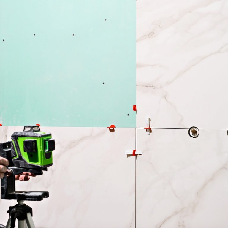 Laser metering during the renovation of the bathroom, the master adjusts the level. Construction tools and equipment tile sticker on the wall. Green lines of the laser beam for level measurement